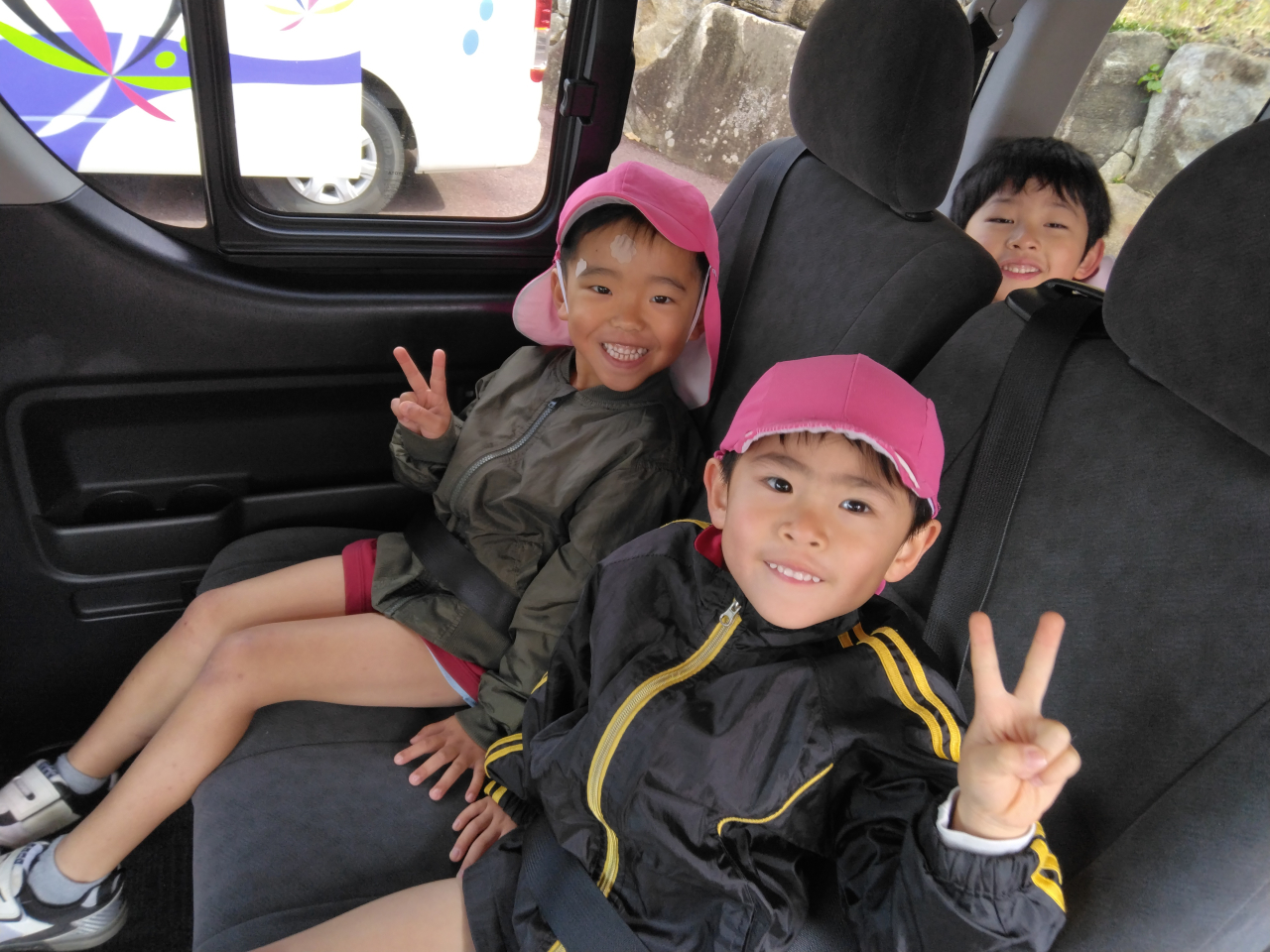 朝から「俺、100個食べる!」と気満々の子どもたち。ジャンボタクシーに乗っていざ出発‼タクシーの中でもお喋りが止まりません。