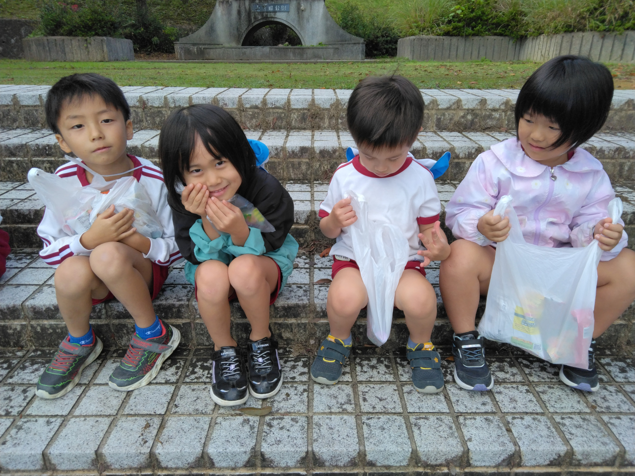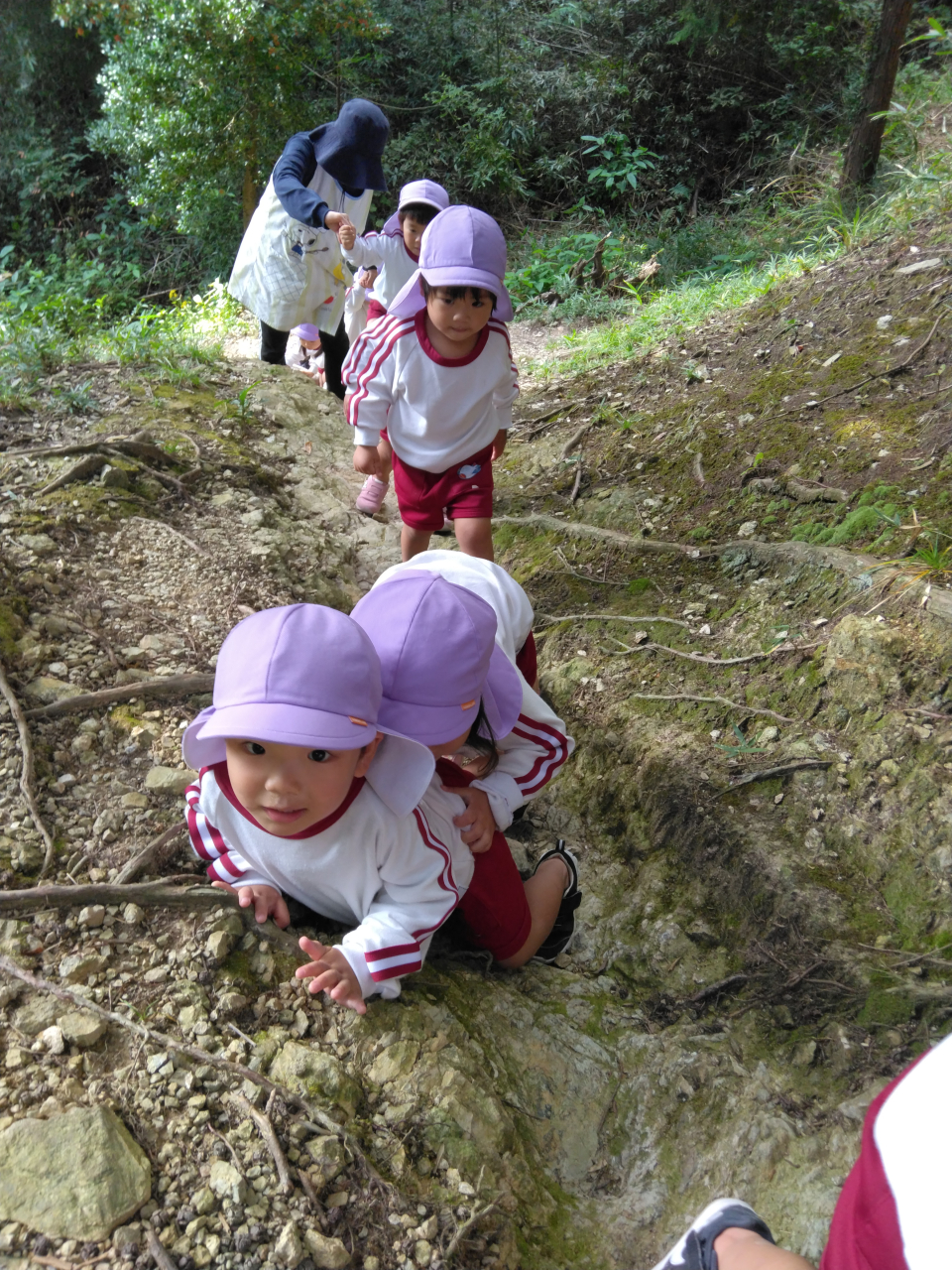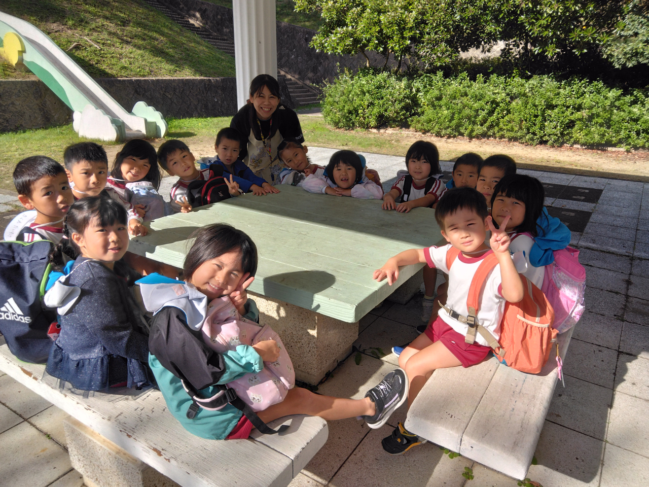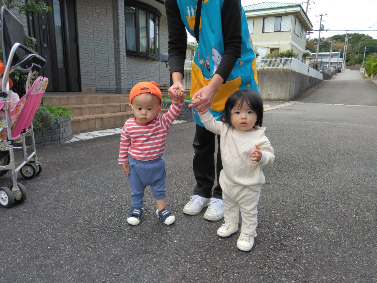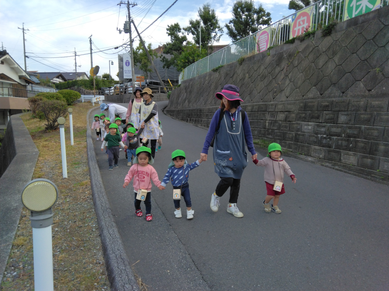 どんぐりころころの歌をエンドレスで歌ったり、ちょうちょを見つけるとちょうちょの歌を歌ったり、今日のお弁当に何が入っているか話したり、楽しいお散歩タイムです
