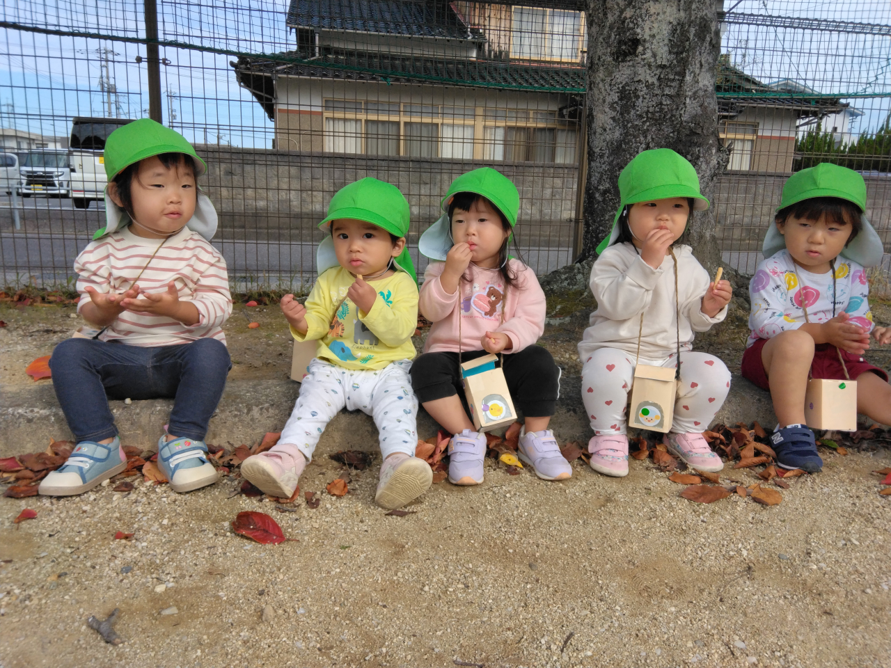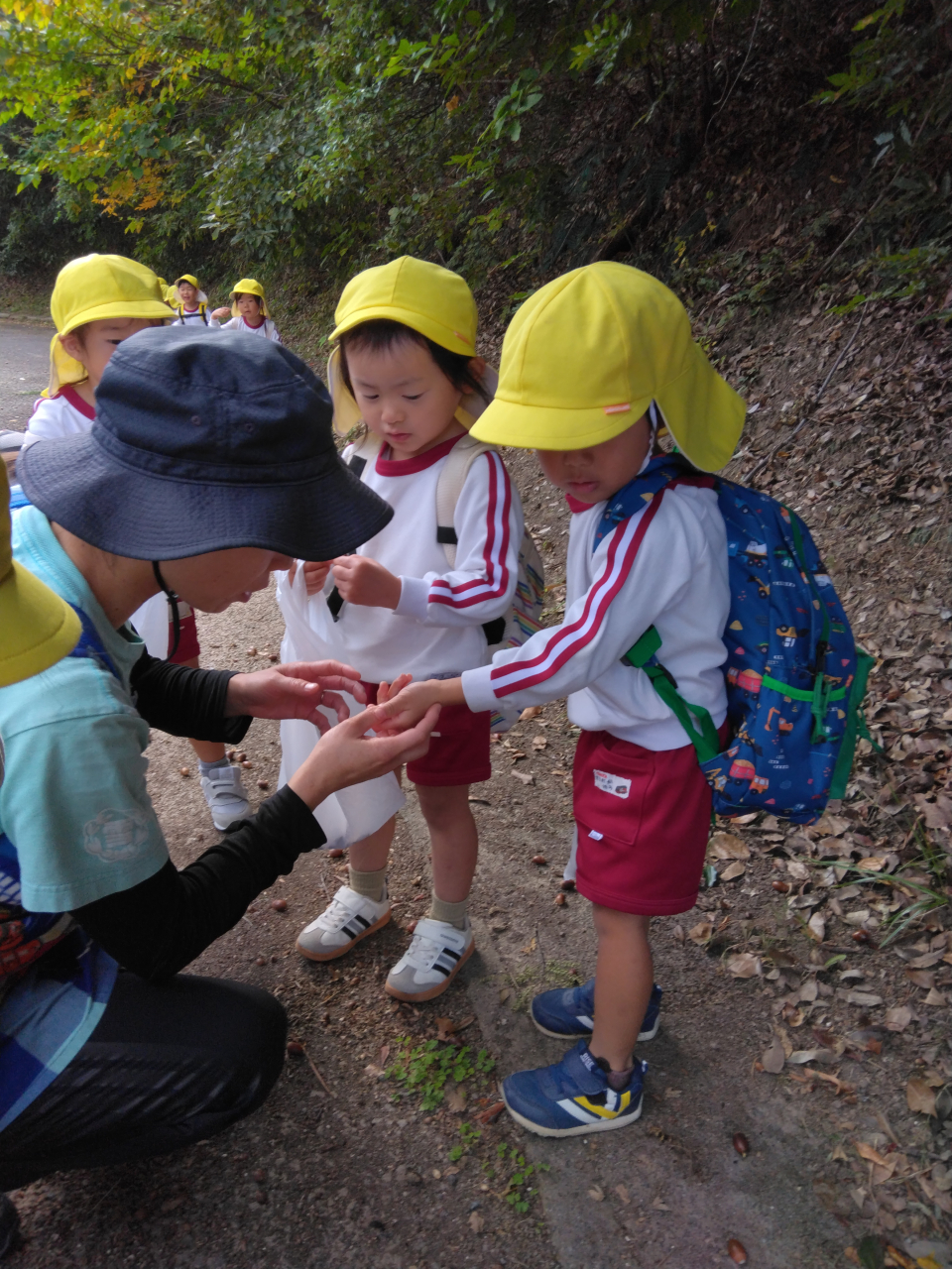 どんぐりや葉っぱを見つけてお散歩バッグに入れたり、滑り台で遊んだり、楽しく過ごしました