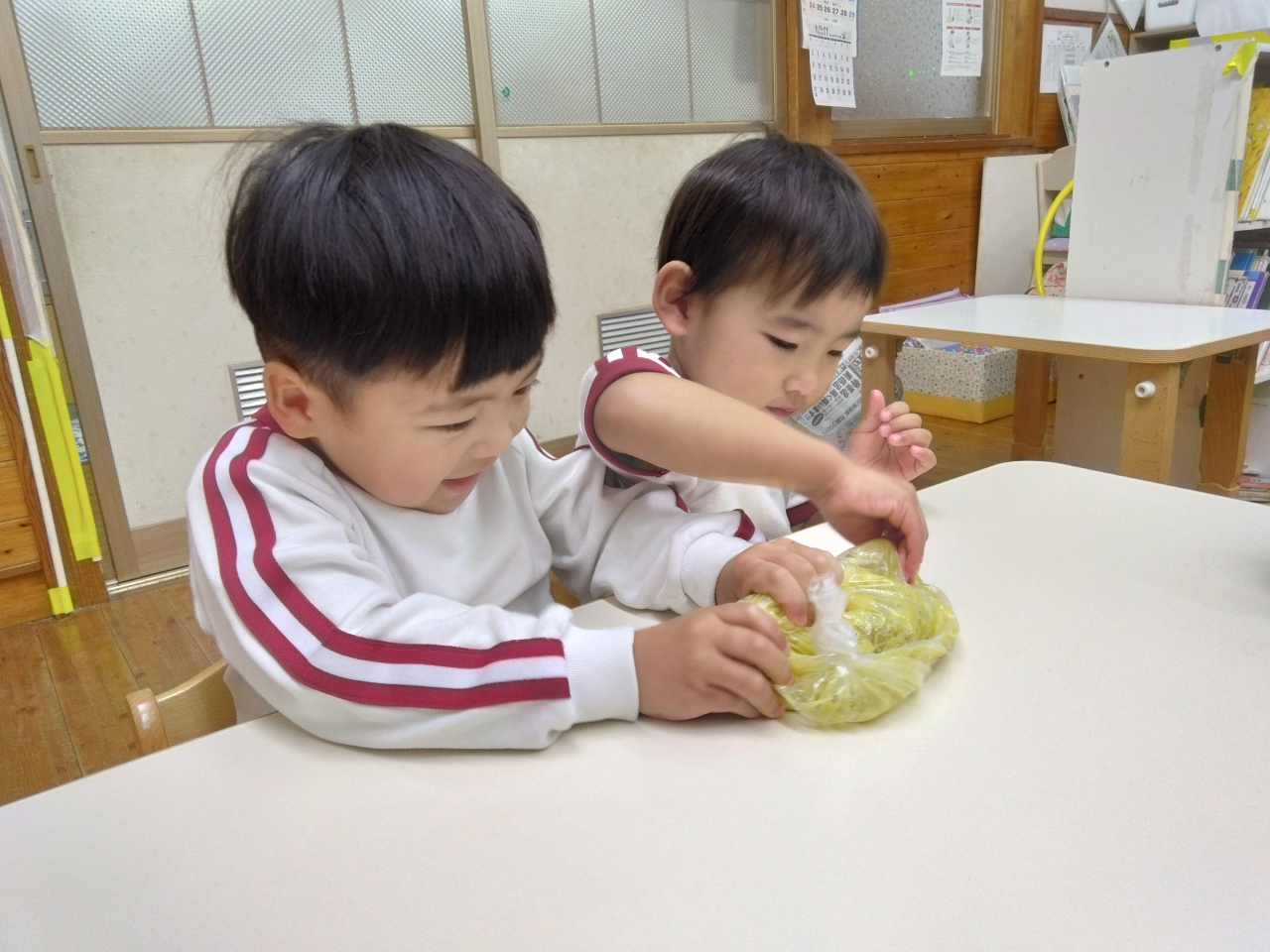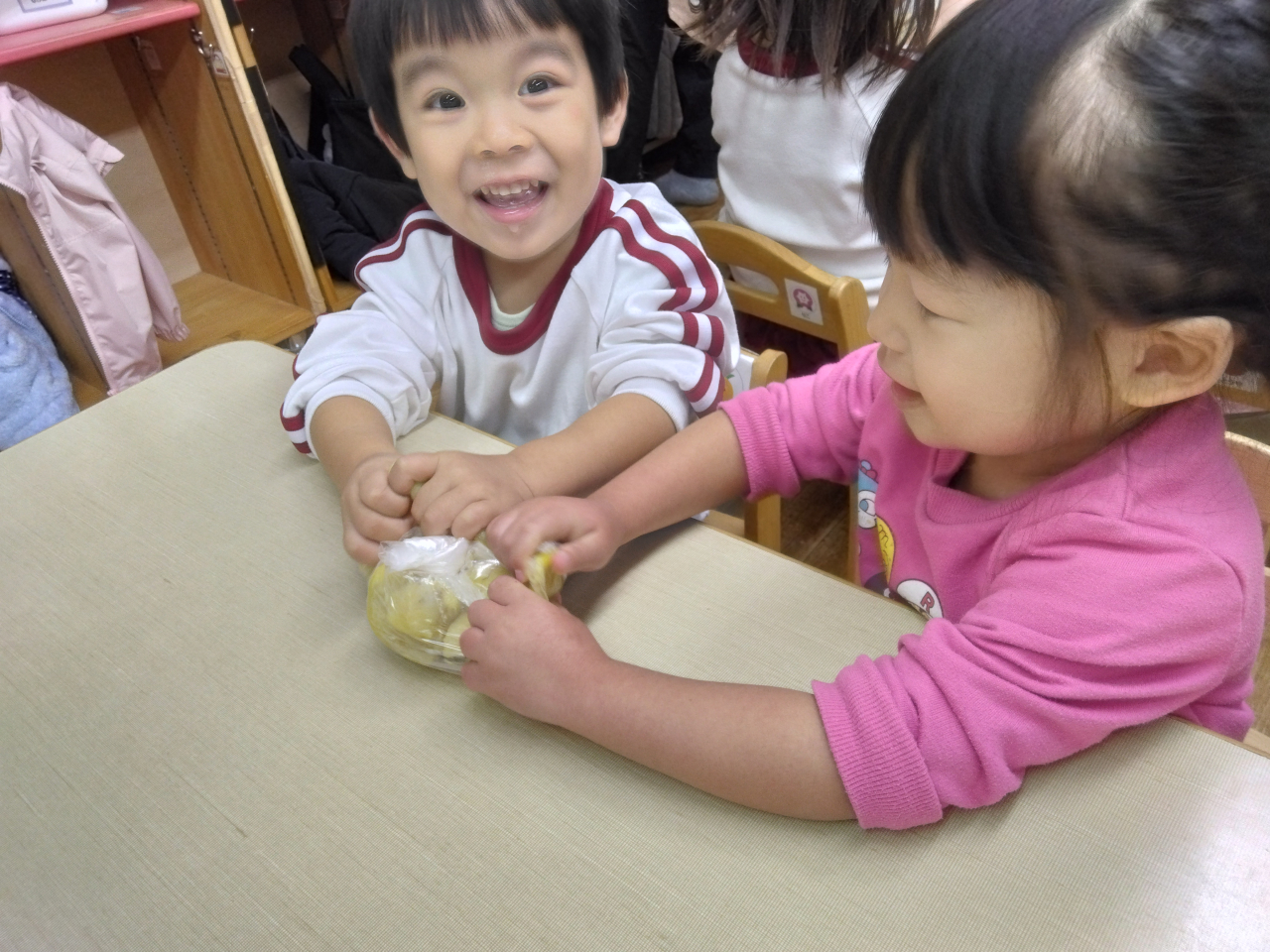 かわりばんこにもみもみつぶします。くにゅっとした感触がおもしろくて、楽しそうにつぶしていました