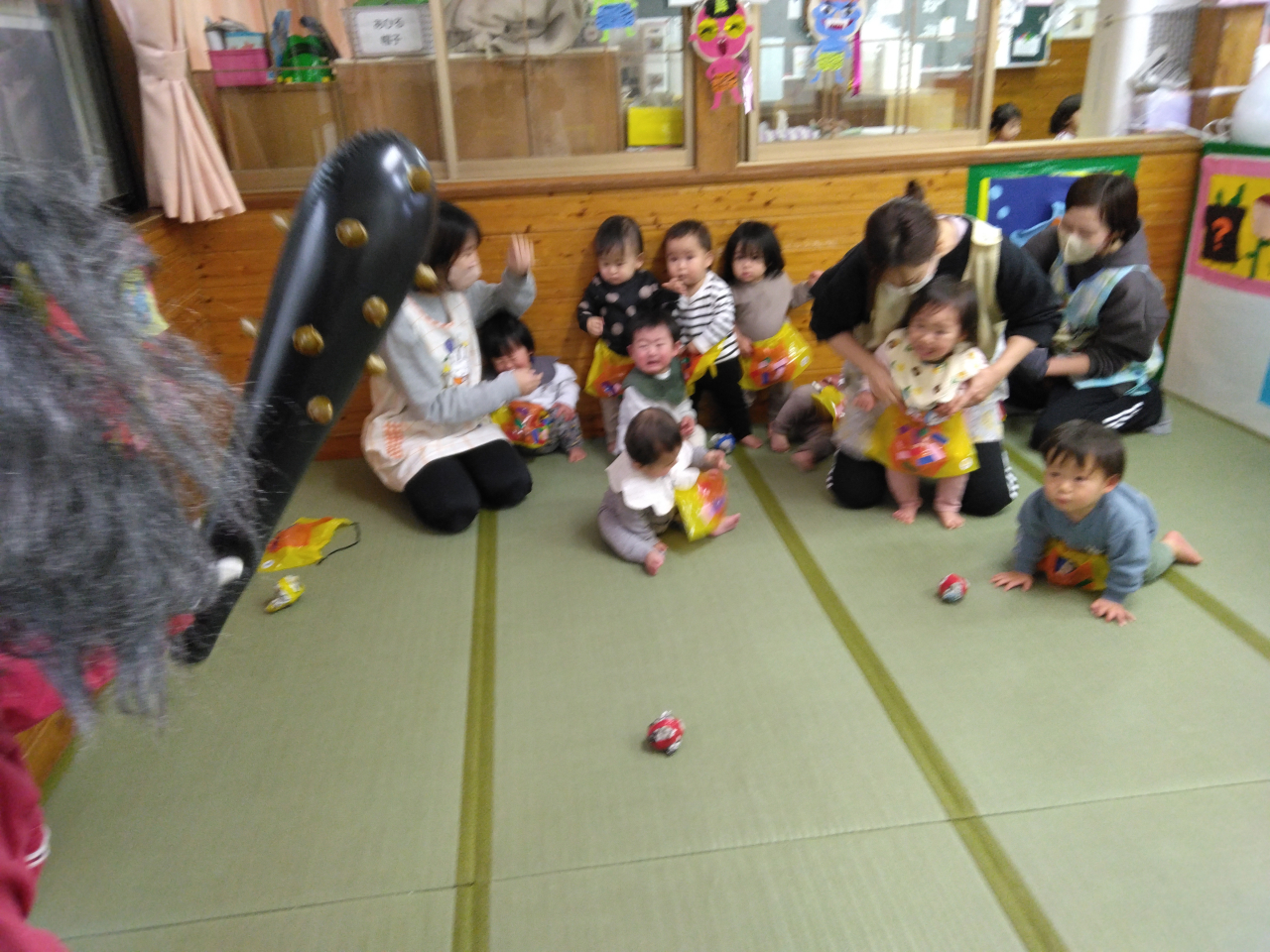 あひる組さんはテラス側の窓から鬼がやって来て、部屋の隅に逃げたり、先生の膝に飛び乗って守ってもらったりしていましたよ💦