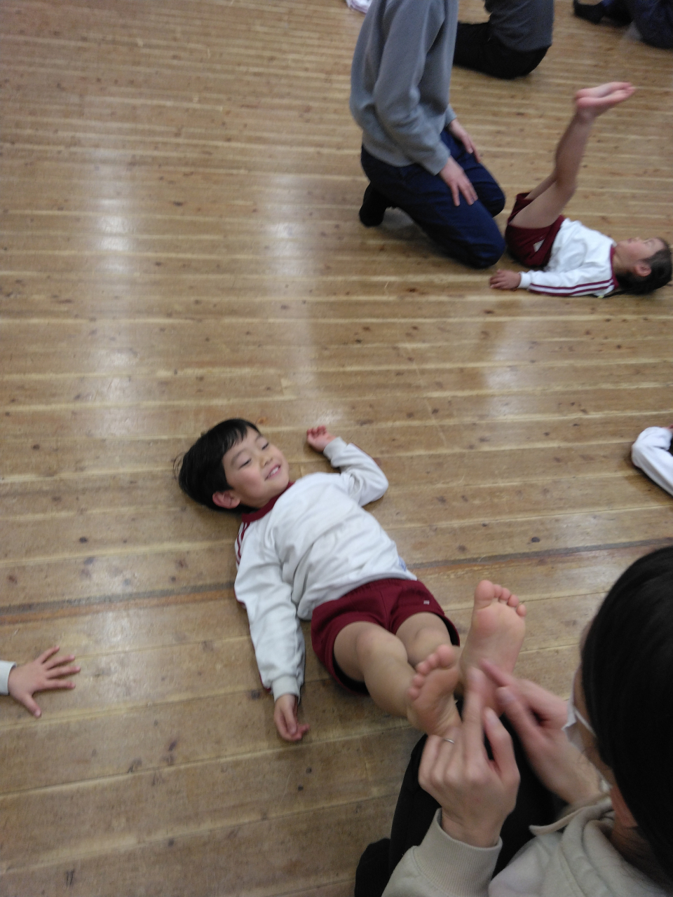 寝転んで足を上げ、グッと押してもらって起き上がるのも頑張っていました