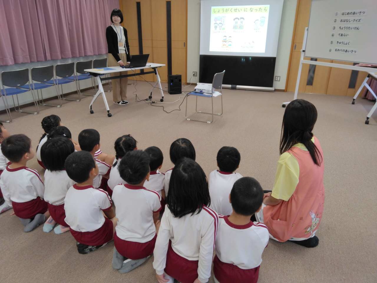 始めに学校給食についてお話しを聞いたり、給食にまつわるクイズに挑戦しました