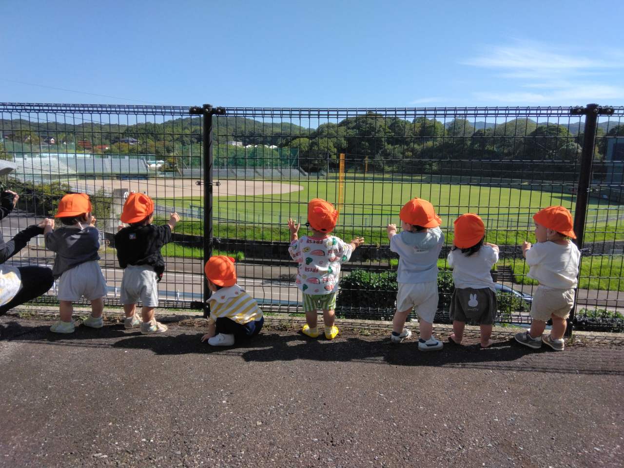 ベビーカーでお散歩のお友だちも、フェンスの所では降りてみて、向こうに走る車を見たり、トンボやちょうちょを見て楽しみました