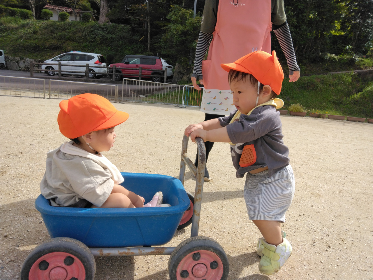 園庭では手押し車で遊んだりもします。お友だちを乗せて、楽しくあるいていますよ