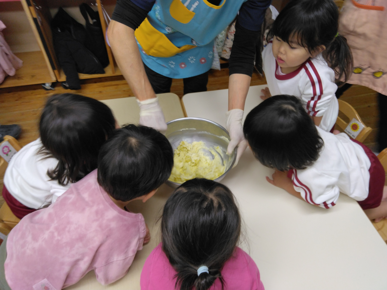 つぶしたさつま芋に、バター、砂糖、ホットケーキミックスを加えて、混ぜます。混ざっていく様子を、前のめりになって興味深そうに見る子どもたちです