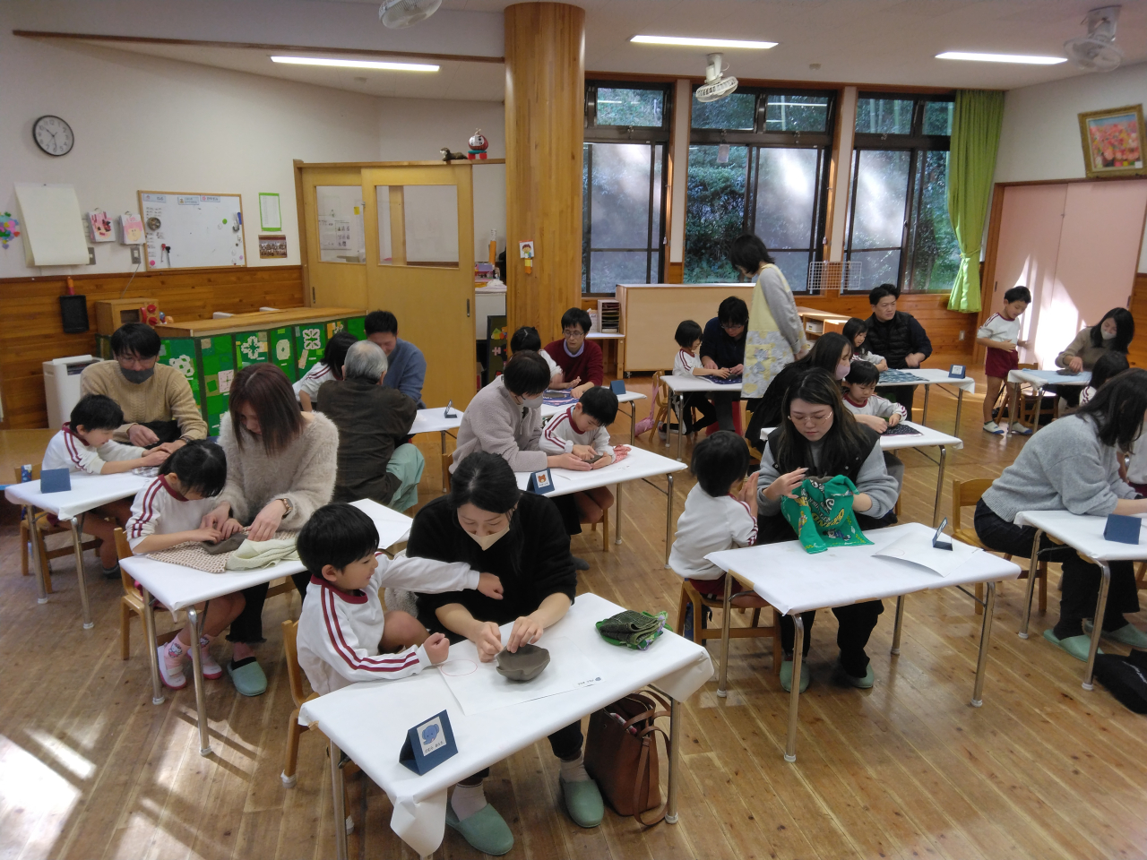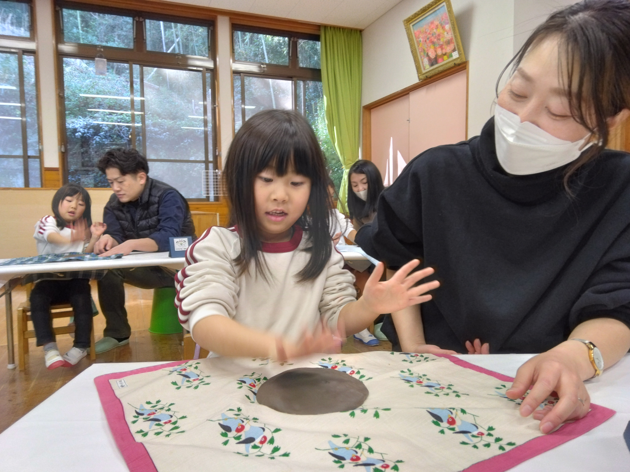 待ちに待った親子活動の日。みんなニコニコで登所です!今回は雪舟焼窯元の福郷さんにお皿作りを教えていただきました。最初にお話を聞きます。もうみんな釘付けです