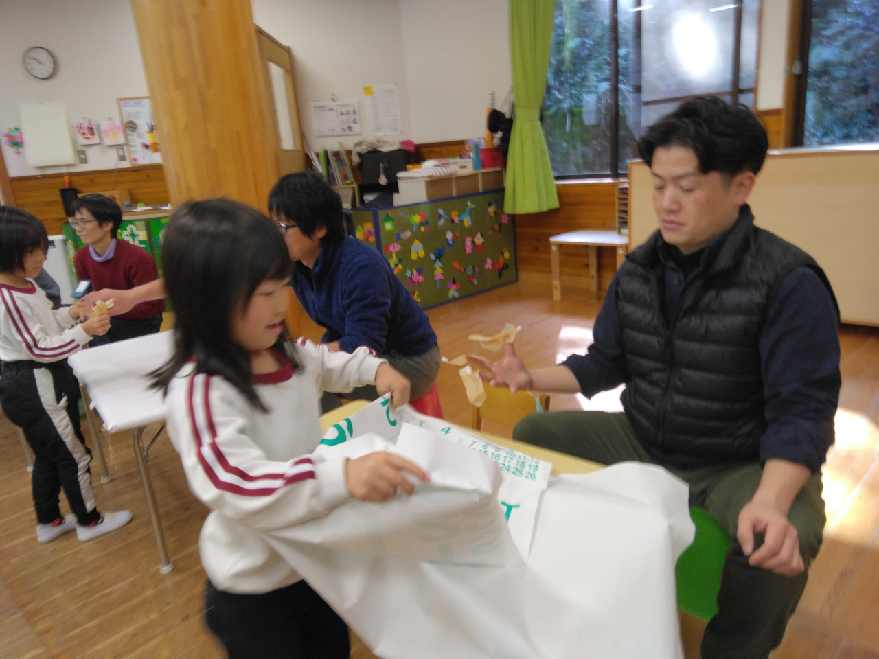 次はお片付けの時間。テーブルに貼ってあった白紙のクロスを自分たちで畳んで片付けるよ~!「お父さん見ていてね