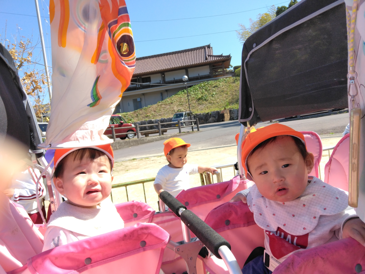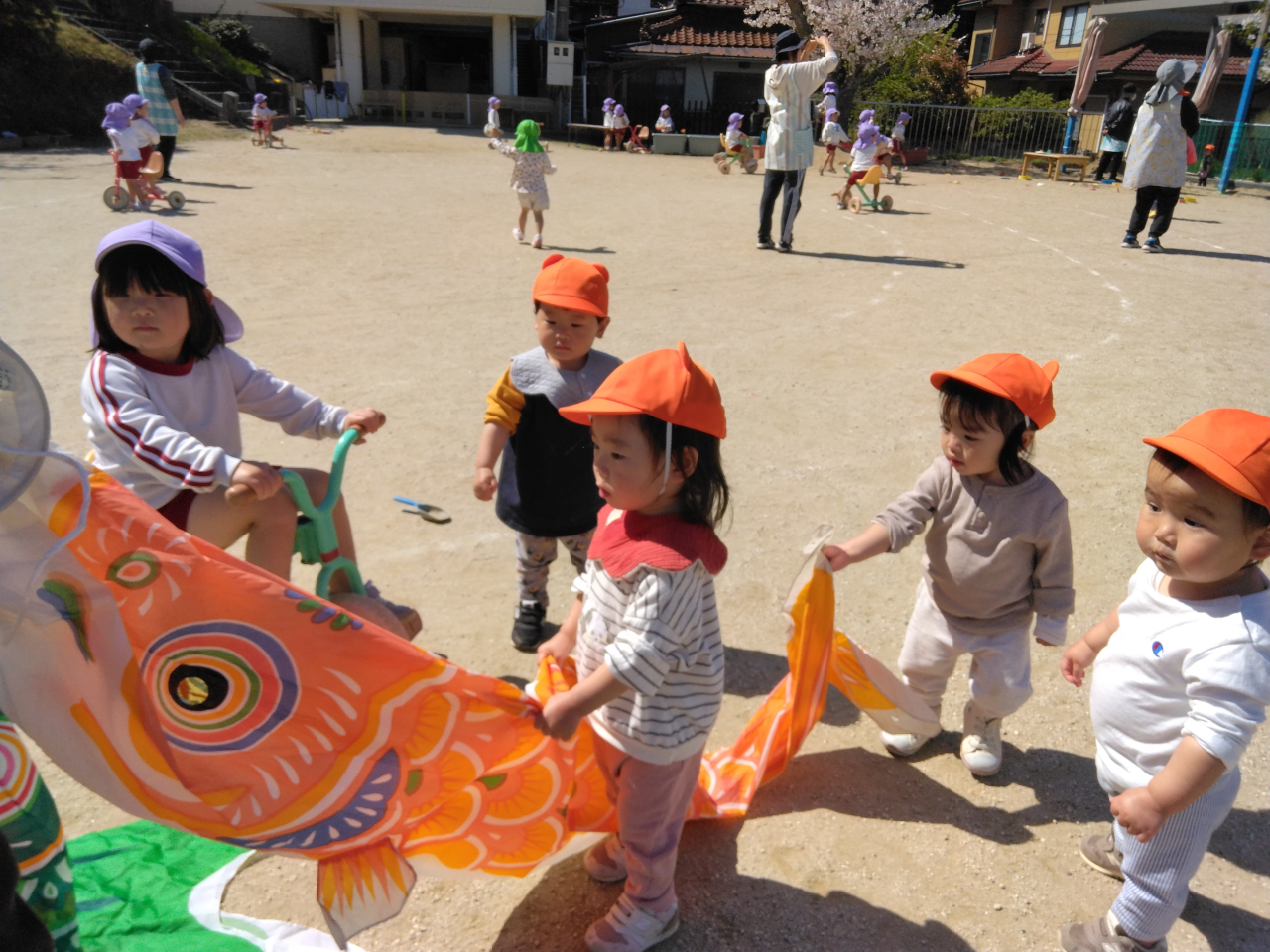 うさぎ組のお姉ちゃん達、こいのぼりさんと園庭をお散歩したよ