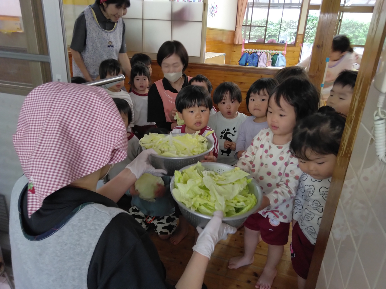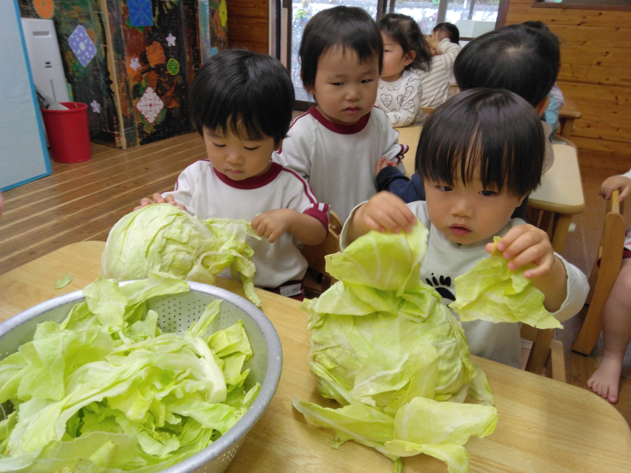 今日もいつものように聞きに行くと給食の先生からキャベツをちぎるお手伝を頼まれました!