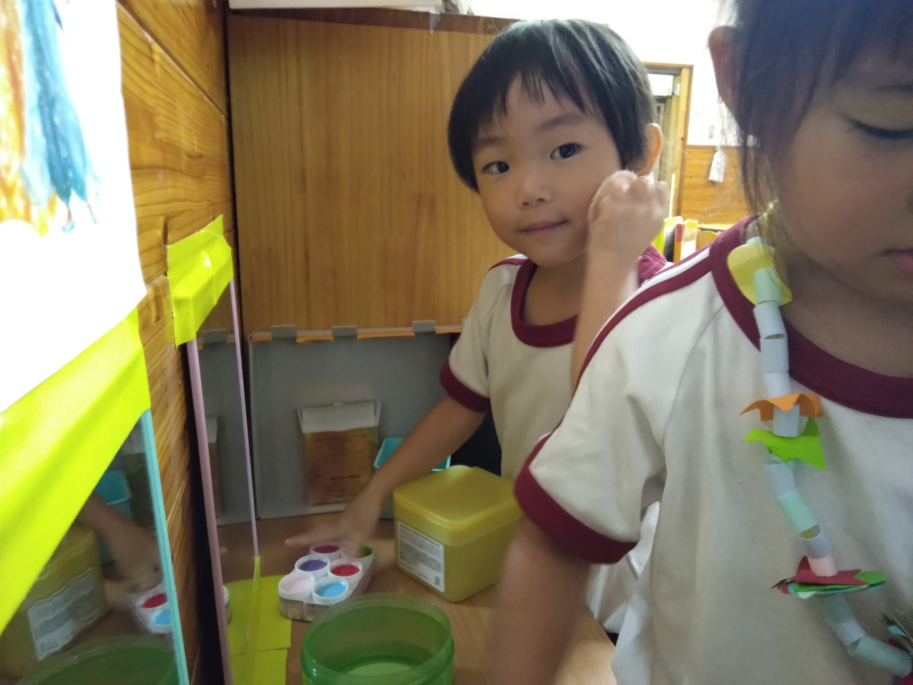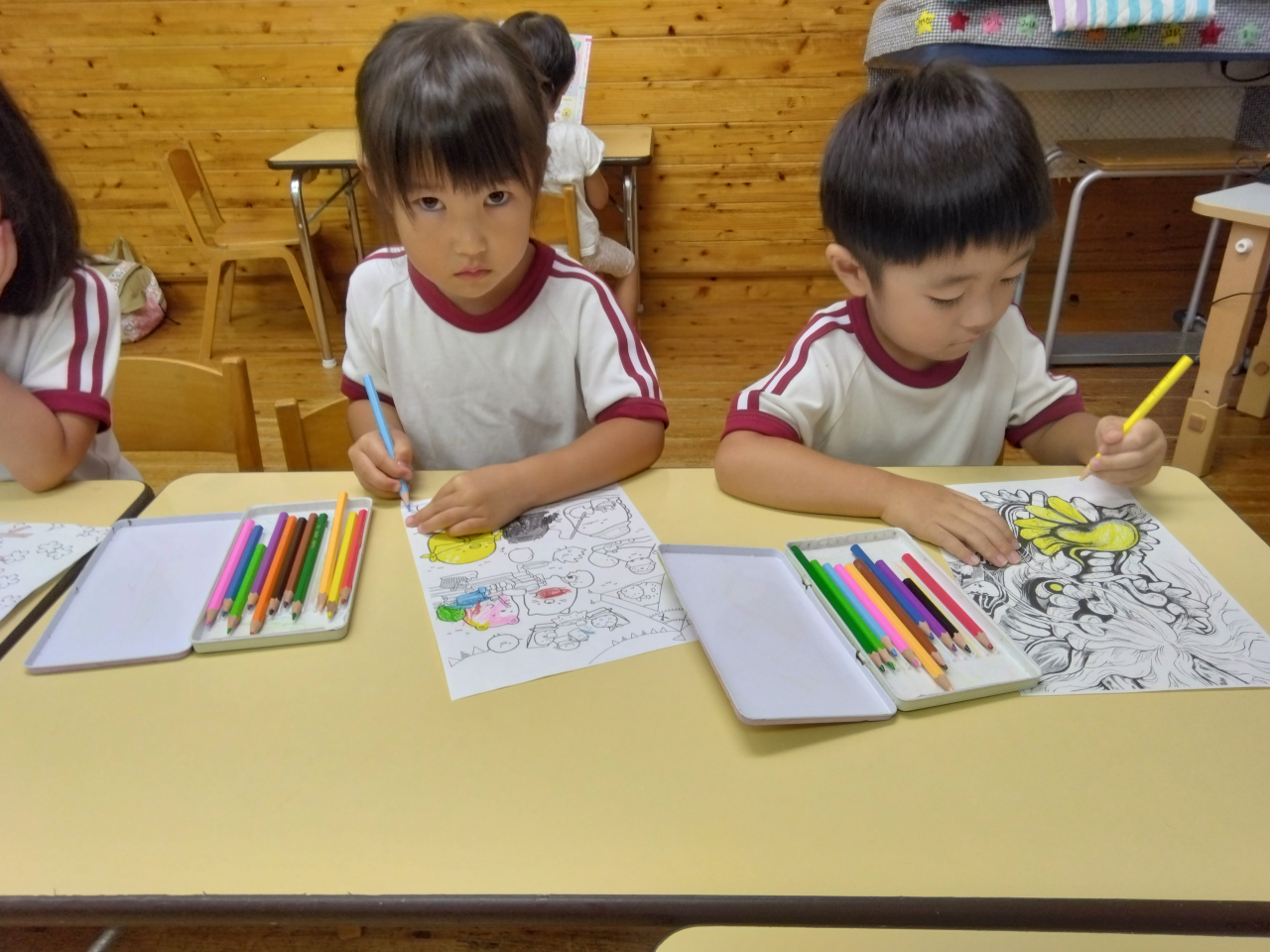 ぬり絵も人気の遊びです線からでないよう慎重に色鉛筆で塗っていますよ。