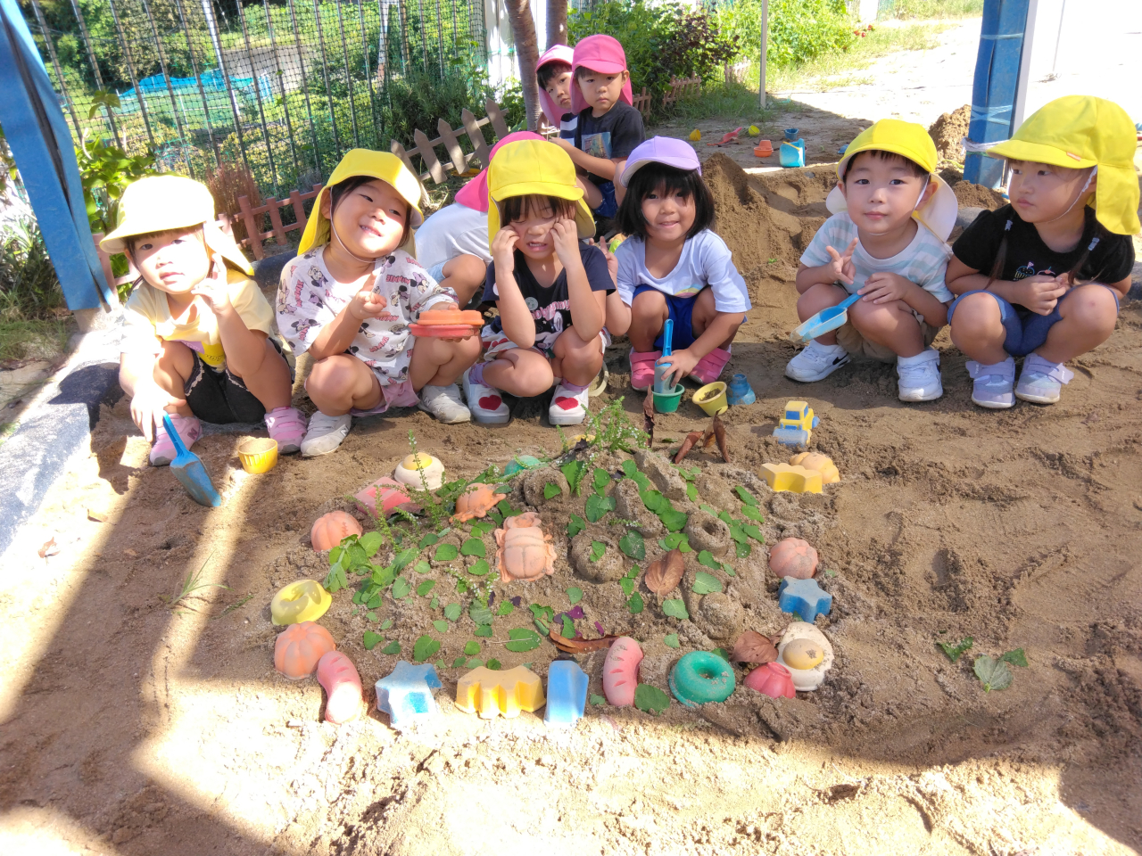 砂遊びが大好きで、友だちと協力して大きいケーキを作っていました