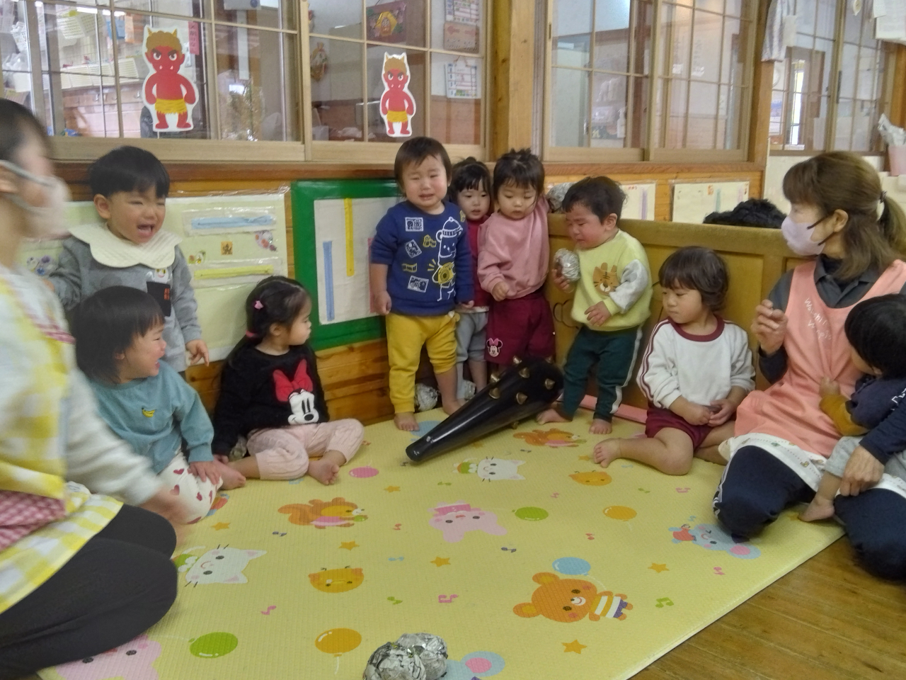 あひる組さんはテラス側の窓から鬼がやって来て、部屋の隅に逃げたり、先生の膝に飛び乗って守ってもらったりしていましたよ💦