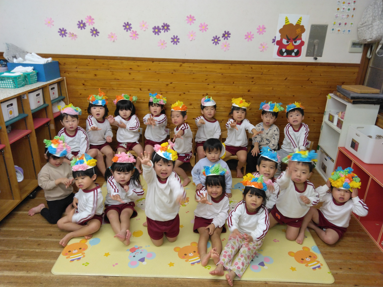 元気いっぱいのりす組さんは鬼帽子を被って、節分に備えて練習しようと張り切っていたところに鬼が登場