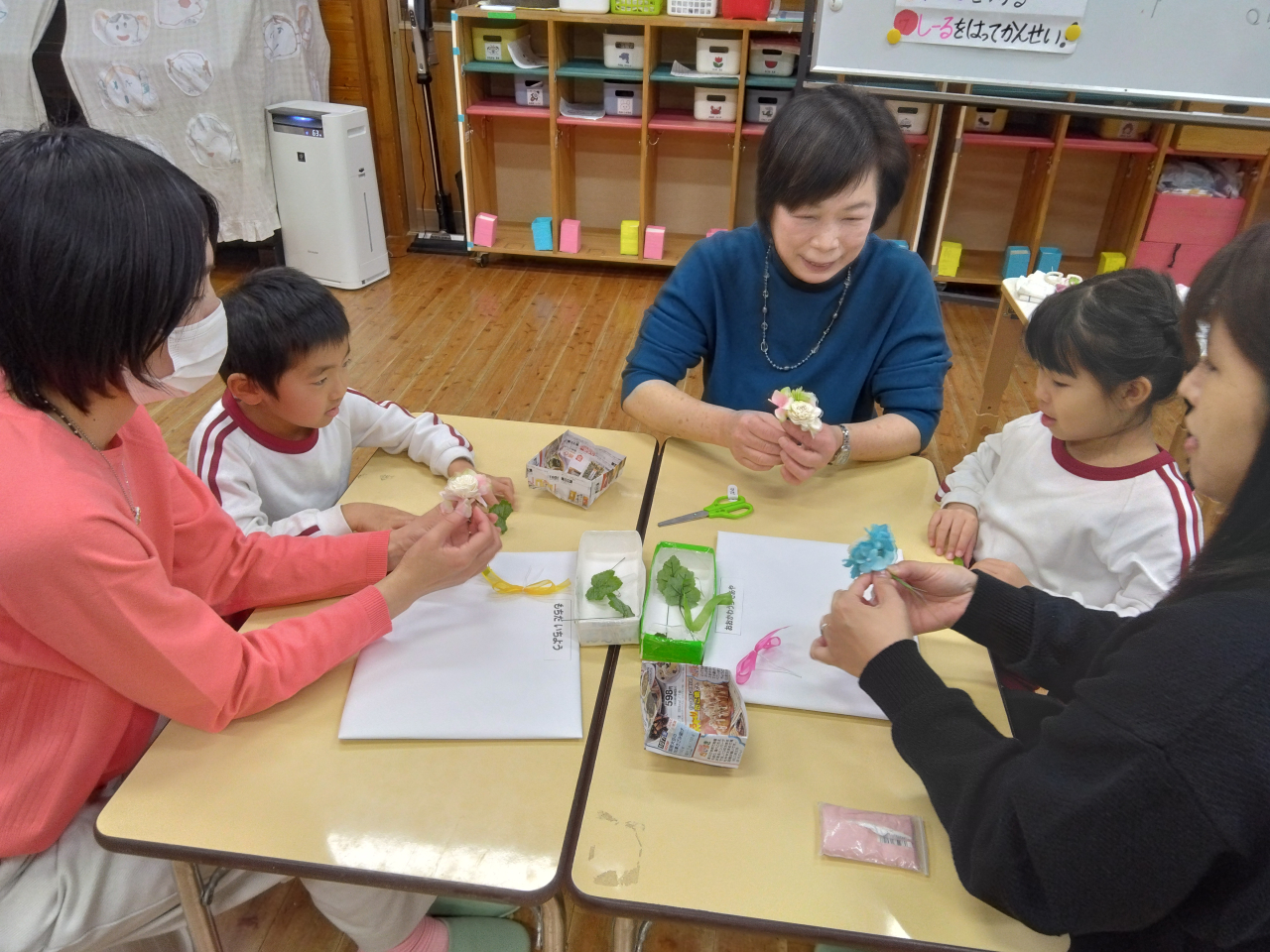 保育所生活、最後の親子ふれあい活動で卒園式に付けるコサージュ作りをしました🌸エムフローラの方に教えていただきながら、親子でお花やリボンを選んで作りましたよ