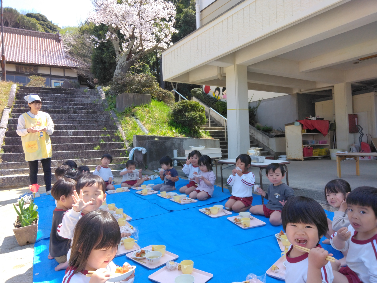 あひる、ひよこ組さんも園庭の桜を見ながら給食を食べましたよ♪お外で食べると美味しいね♡