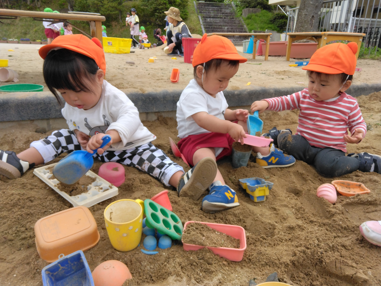 天気のいい日には園庭で砂あそびをしたり散歩に行くのが楽しみで、帽子を被ってうれしそうにしています
