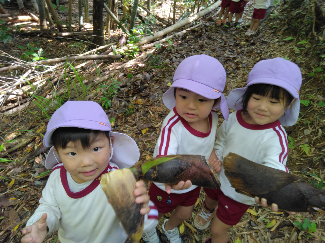 山道コースに入ってみると・・・そこにもタケノコがたくさん生えたり落ちたりしていて、触ってみたり背くらべしたりして楽しんでいました