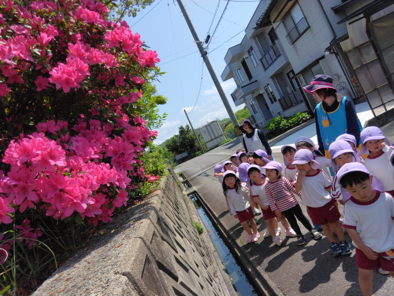 満開のツツジが色々な所に咲いていて、「ここにもある!」「赤色もあるよ!」など教えてくれました♪